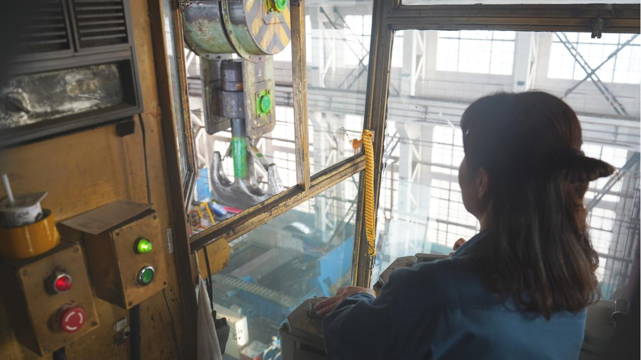 重裝車間高懸的“天車”駕駛艙內(nèi),駕駛員陳媚媚正全神貫注,借助對(duì)講機(jī)與地面人員的手勢信號(hào),上下、左右緩緩?fù)评僮鳁U,鐵鉤吊著幾十噸重的鍛壓部件左右移動(dòng),成功落在了作業(yè)地點(diǎn)。