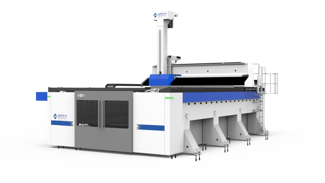 該產(chǎn)品適用于新能源等重點(diǎn)領(lǐng)域的復(fù)雜型面的復(fù)合材料五軸聯(lián)動(dòng)加工,具有高速度、高效率、高安全性、綠色環(huán)保等特點(diǎn)。橫梁采用高剛性加長設(shè)計(jì),橋梁間距4700mm,通過性更好,適合大尺寸工件加工;高速電主軸銑頭為單臂式結(jié)構(gòu),采用力矩電機(jī)直驅(qū),最高轉(zhuǎn)速20000r/min,可有效提升加工效率;直線軸均為滾柱直線導(dǎo)軌,全齒輪齒條傳動(dòng),最高速度可達(dá)85m/min,并配備液壓緩沖與線性制動(dòng)雙重保護(hù),安全性大幅提升;產(chǎn)品標(biāo)配柔性護(hù)頂?shù)娜忾]式防護(hù)結(jié)構(gòu),安全環(huán)保性能優(yōu)異。