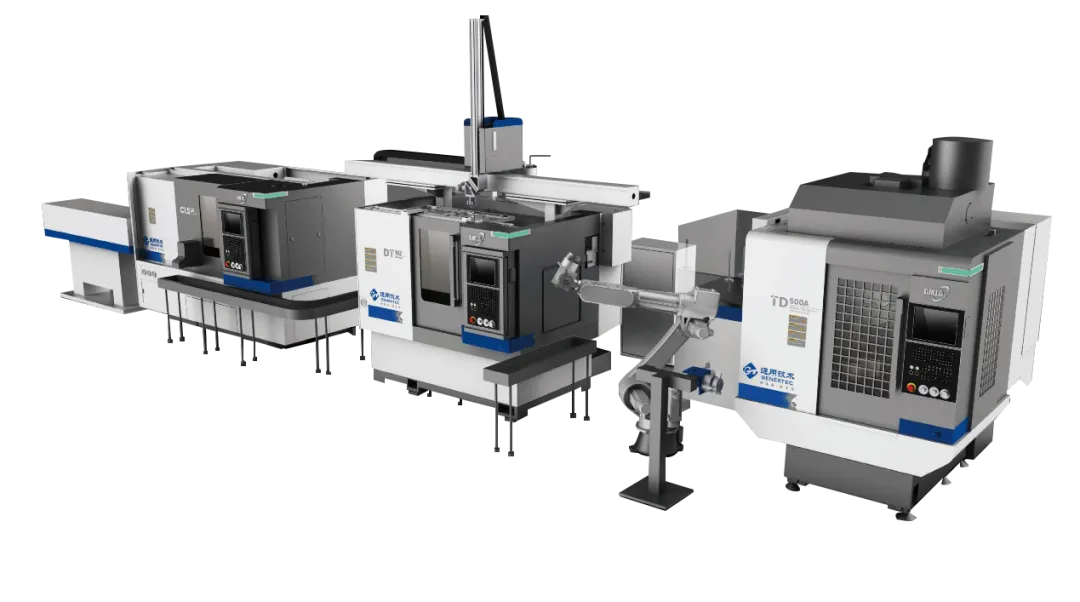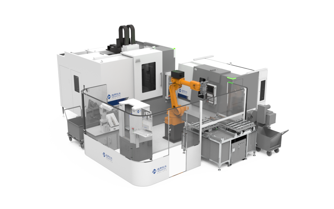 該生產(chǎn)線適用于環(huán)類零件的車削、銑削、鉆孔、攻絲等工序自動(dòng)化高效加工,由2臺(tái)數(shù)控車床、1臺(tái)鉆攻中心、自動(dòng)送料機(jī)、機(jī)動(dòng)料道、桁架機(jī)械手、機(jī)器人、快換爪庫、旋轉(zhuǎn)下料倉等主輔設(shè)備組成。主機(jī)數(shù)控系統(tǒng)全部使用通用技術(shù)集團(tuán)自主研發(fā)的i5系統(tǒng),具備數(shù)據(jù)采集、程序調(diào)用、實(shí)時(shí)報(bào)警等數(shù)字化、智能化功能;配備電子看板,可實(shí)時(shí)顯示加工狀態(tài)、設(shè)備信息。