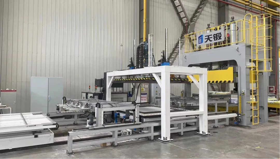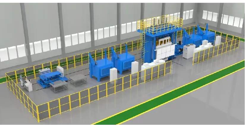 該生產(chǎn)線主要適用于新能源汽車復(fù)合材料輕量化應(yīng)用,由裁切單元、預(yù)成型單元、模壓成型單元和切割加工單元等組成,整線年產(chǎn)量最大可達(dá)到10萬件。產(chǎn)線設(shè)備具有滑塊動(dòng)態(tài)位置控制系統(tǒng);具有國內(nèi)首創(chuàng)微開模技術(shù),實(shí)現(xiàn)自動(dòng)調(diào)節(jié)鎖模力;采用全自動(dòng)數(shù)字控制技術(shù),設(shè)備加工一致性誤差小于10%;裝備遠(yuǎn)程運(yùn)維系統(tǒng),可遠(yuǎn)程快速診斷設(shè)備故障、實(shí)時(shí)狀態(tài)監(jiān)測與預(yù)測性維護(hù)。
