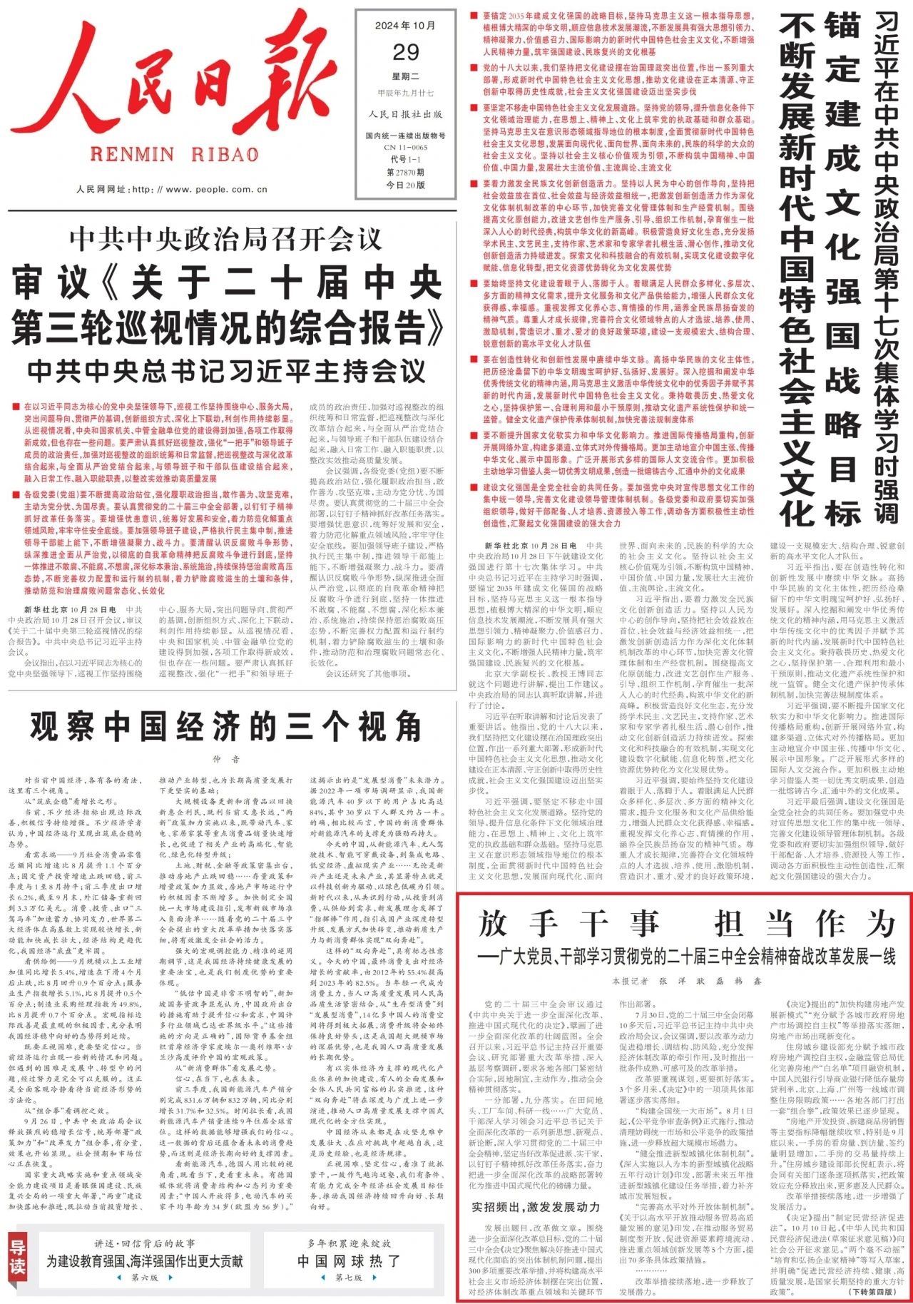 新征程上,廣大黨員、干部堅(jiān)持不懈用習(xí)近平新時(shí)代中國(guó)特色社會(huì)主義思想凝心鑄魂,深入學(xué)習(xí)貫徹黨的二十屆三中全會(huì)精神,放手干事、擔(dān)當(dāng)作為,為進(jìn)一步全面深化改革、推進(jìn)中國(guó)式現(xiàn)代化而努力奮斗。