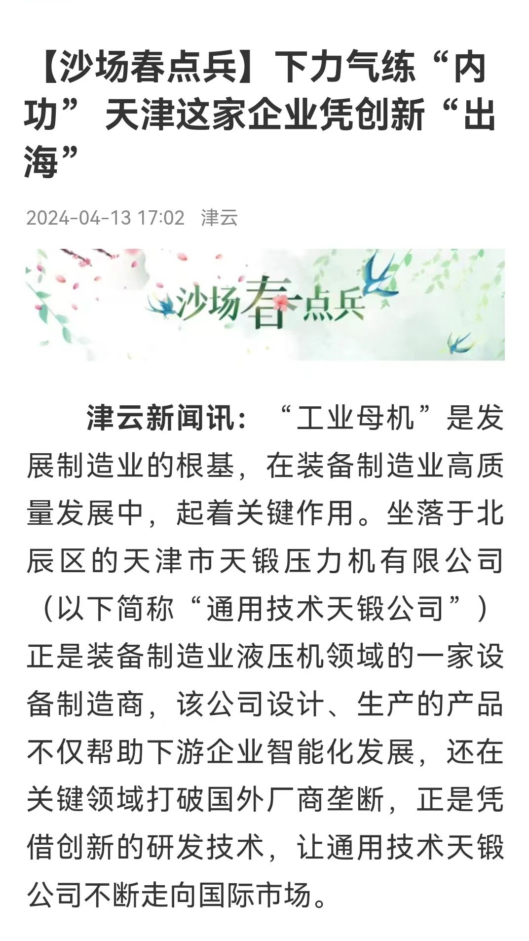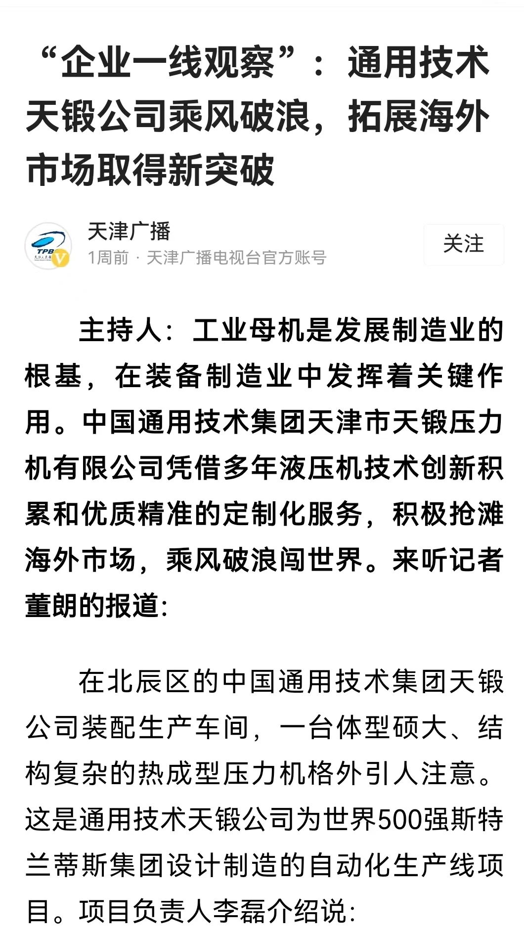 “工業(yè)母機是發(fā)展制造業(yè)的根基,在裝備制造業(yè)中發(fā)揮著關(guān)鍵作用。中國通用技術(shù)集團天津市天鍛壓力機有限公司憑借多年液壓機技術(shù)創(chuàng)新積累和優(yōu)質(zhì)精準的定制化服務(wù),積極搶灘海外市場,乘風破浪闖世界?!?
