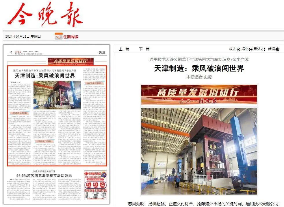 《今晚報》大版面報道了公司贏過諸多知名世界級對手,拿到全球第四大汽車制造商7條熱成形生產(chǎn)線訂單,乘風破浪闖世界背后的故事。